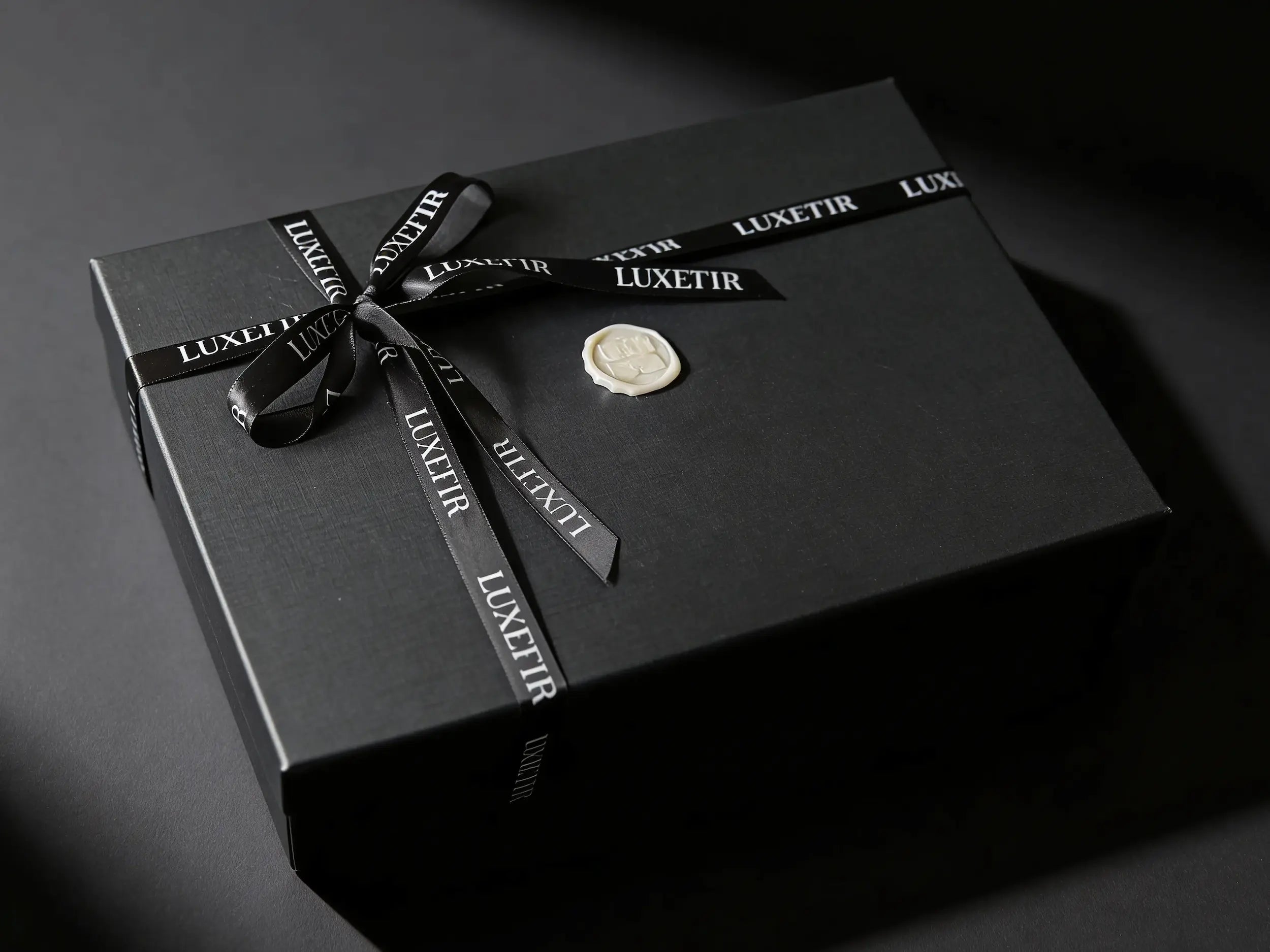 Boîte rigide noire mate, fermée par un ruban noir siglé LUXEFIR et scellée d’un cachet de cire clair avec le logotype de la marque au centre, pour un rendu élégant, sobre et haut de gamme, pensé pour sublimer votre expérience d’unboxing.